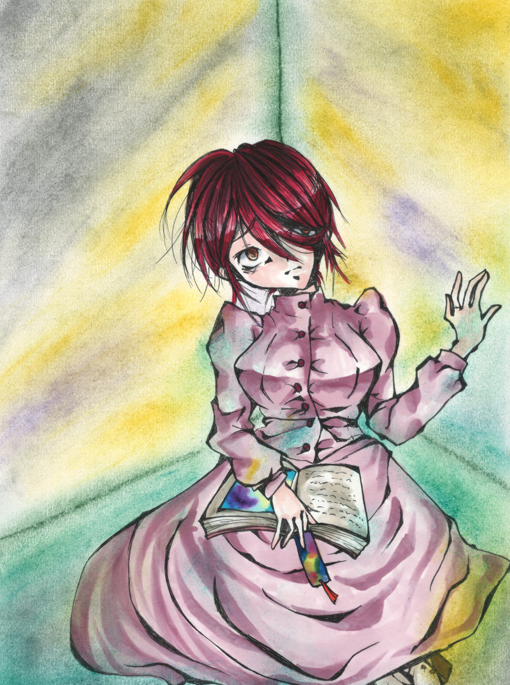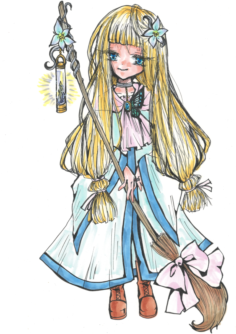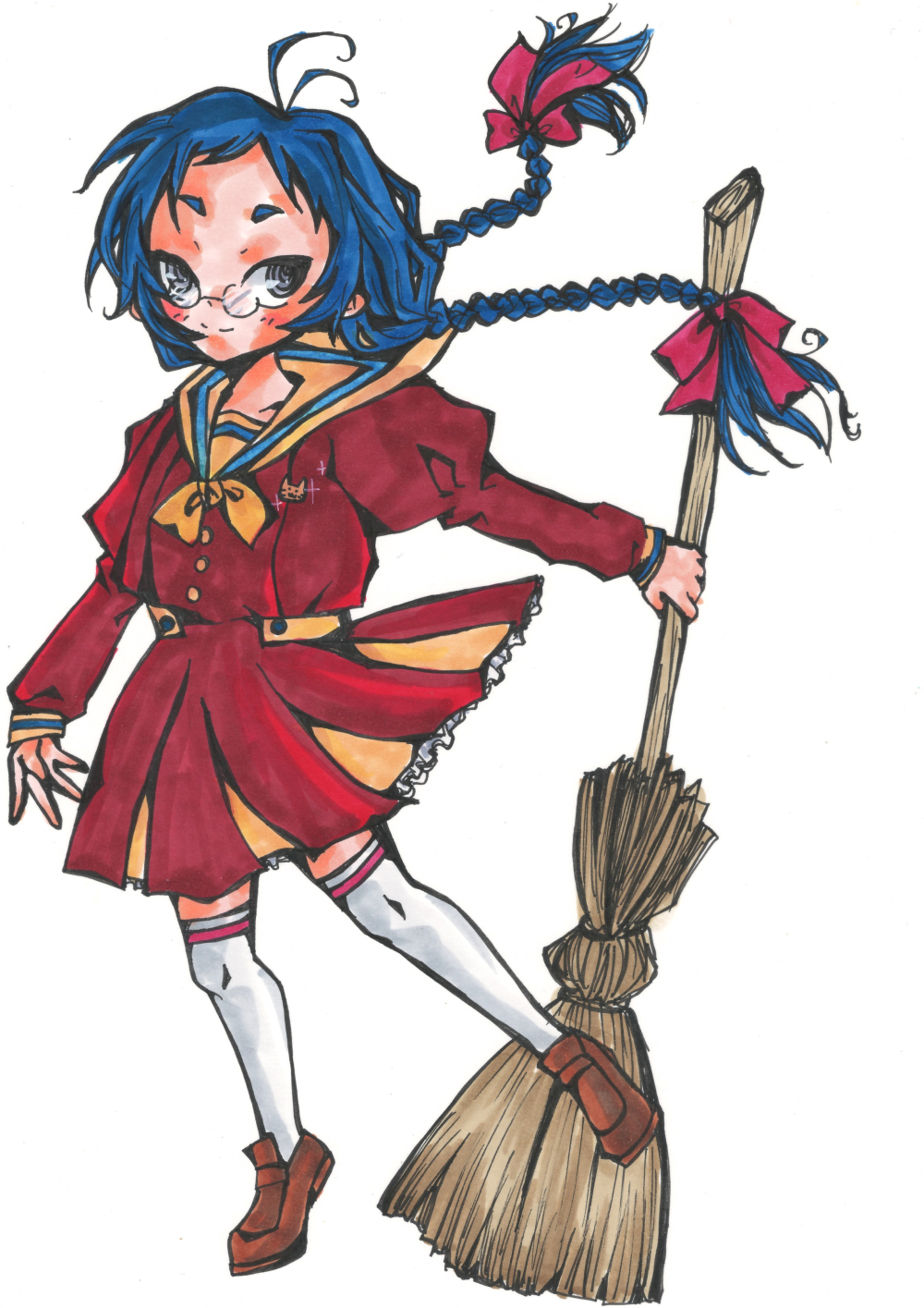 黒髪に灰色の瞳。丸眼鏡にセーラーワンピース。二つみつあみのおさげの少女。箒を持っている。